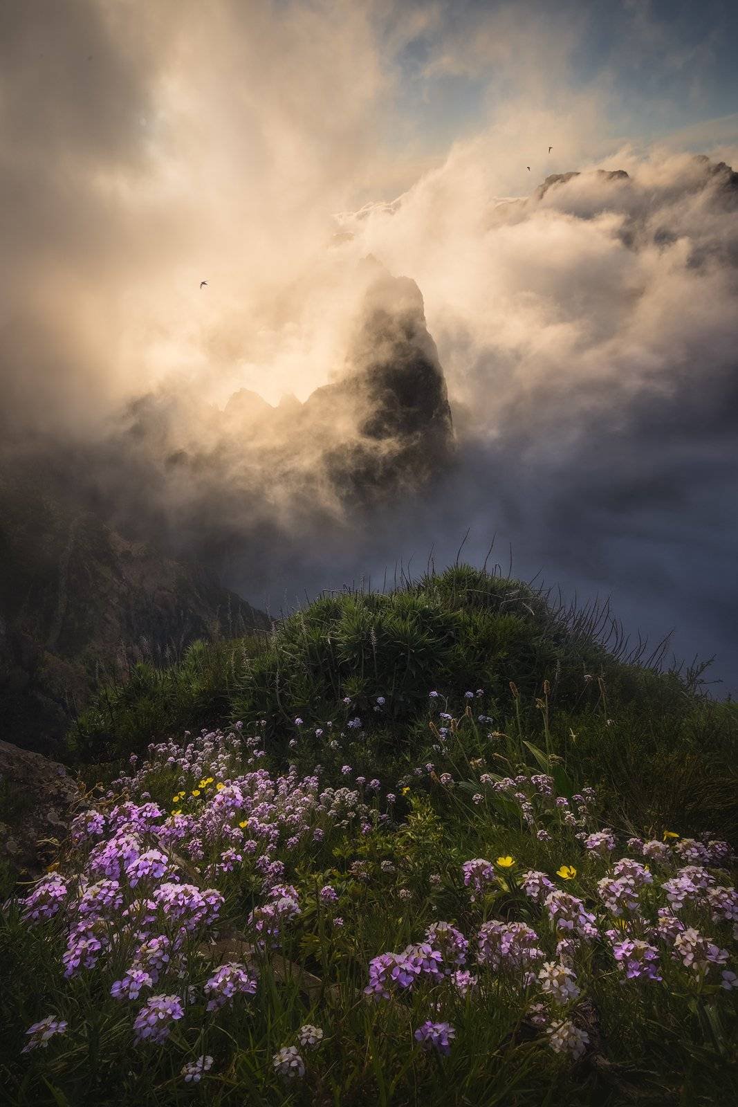 For technical details, I brought a variety of equipment with me. My 16-35mm lens was perfect for getting dramatic wide-angle scenes, including the foreground flowers and the peaks. My telephoto 100-400mm lens was absolutely perfect for hiking around and picking out little scenes in the distance. This allowed me to simplify the compositions, focusing on specific shapes and textures. Since it was still early and bright out, I was also able to handheld those shots. If I could bring any lenses on a fog adventure, it would be those two. In addition to that, I also had my drone and some extra equipment for fun.