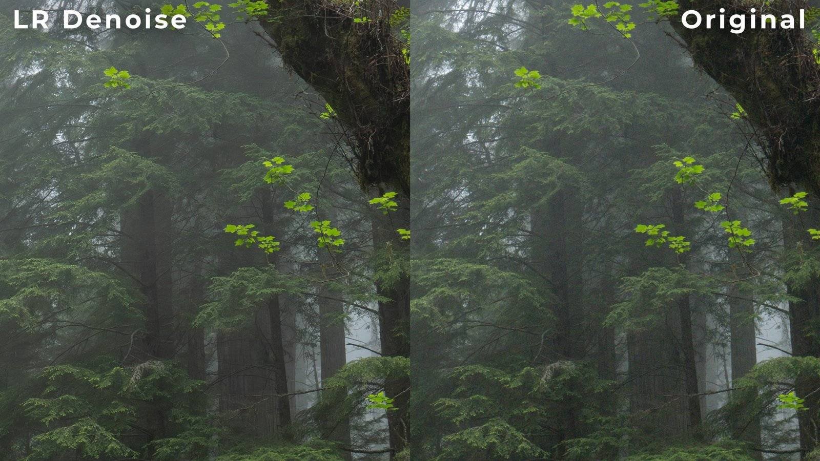 Here is our second example, a super under-exposed redwood shot at 500 ISO. You can see a bit of grain, but it’s definitely a more subtle example. Lightroom Denoise did a great job here.