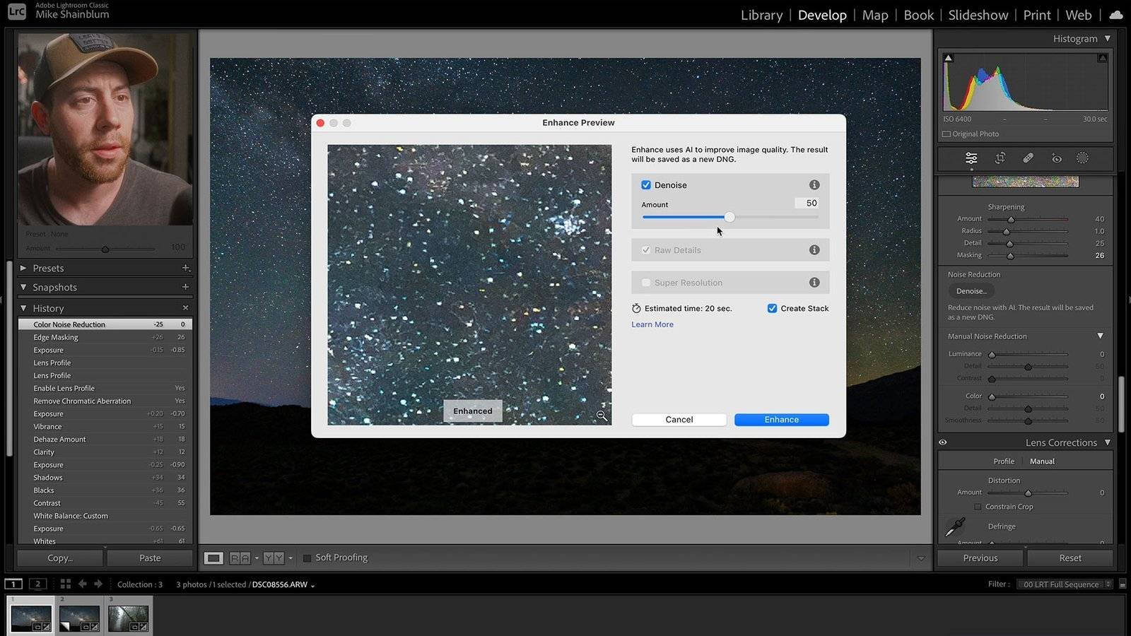 At first glance, I love the simplicity of Lightroom’s Denoise. It’s just a simple button with a slider, and on the left, you get a live preview. I recommend using this tool at around 30-40% for lower ISO files and then 50% for really severe noise reduction. If you go higher than that, the algorithm can remove too much detail from the image. Once you click “Enhance,” the file saves directly as a .DNG into Lightroom.