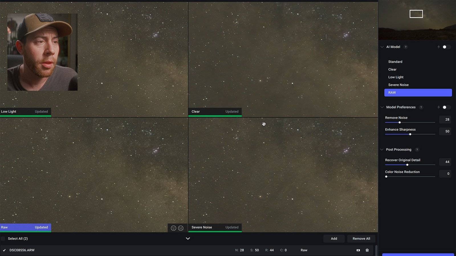 Topaz Labs also has another plug-in called Photo AI. This tool combines all three of their software: Denoise, AI Sharpen, and Gigapixel AI. It’s a great tool, and I use it all the time to enhance images for print. So, I decided to do a quick test to see how RAW noise reduction looks between the two tools. To my eyes, Photo AI did a surprisingly bad job in comparison to the dedicated Denoise Software, both in terms of color retention, noise reduction, and even image compression. In terms of astrophotography in my opinion Lightroom is the best noise reduction tool.