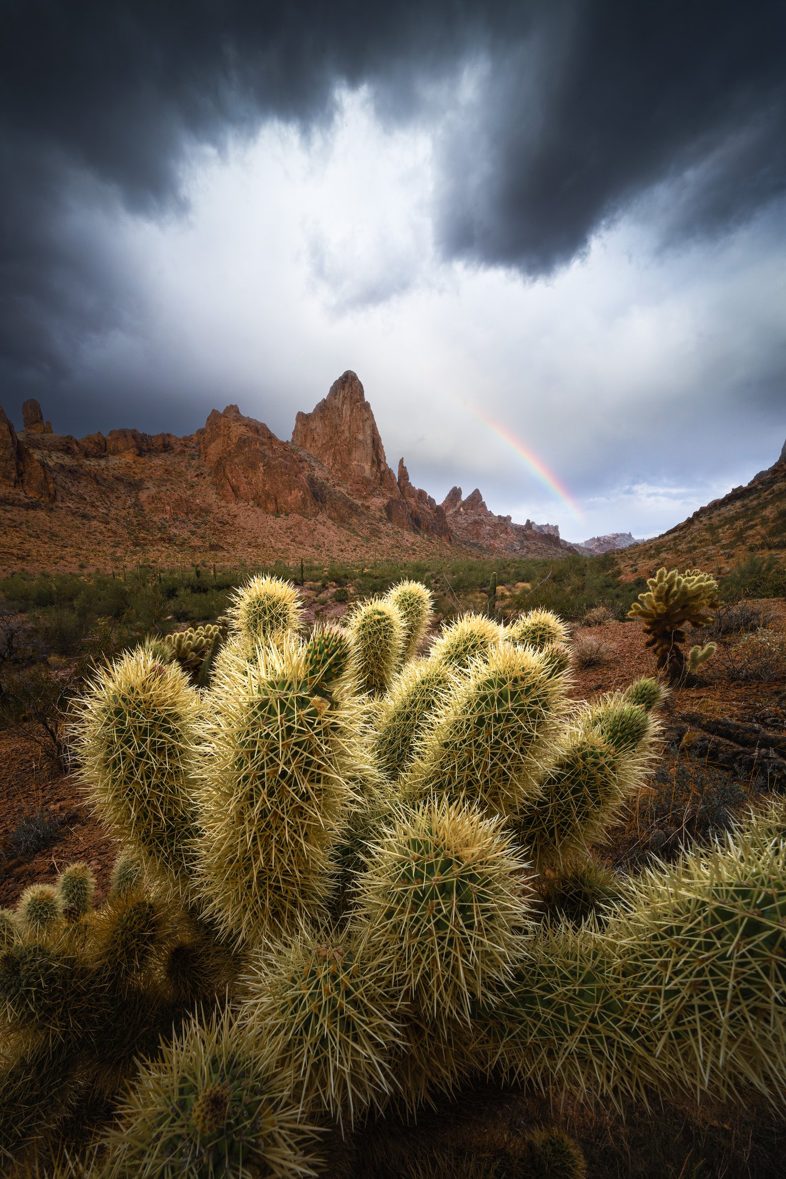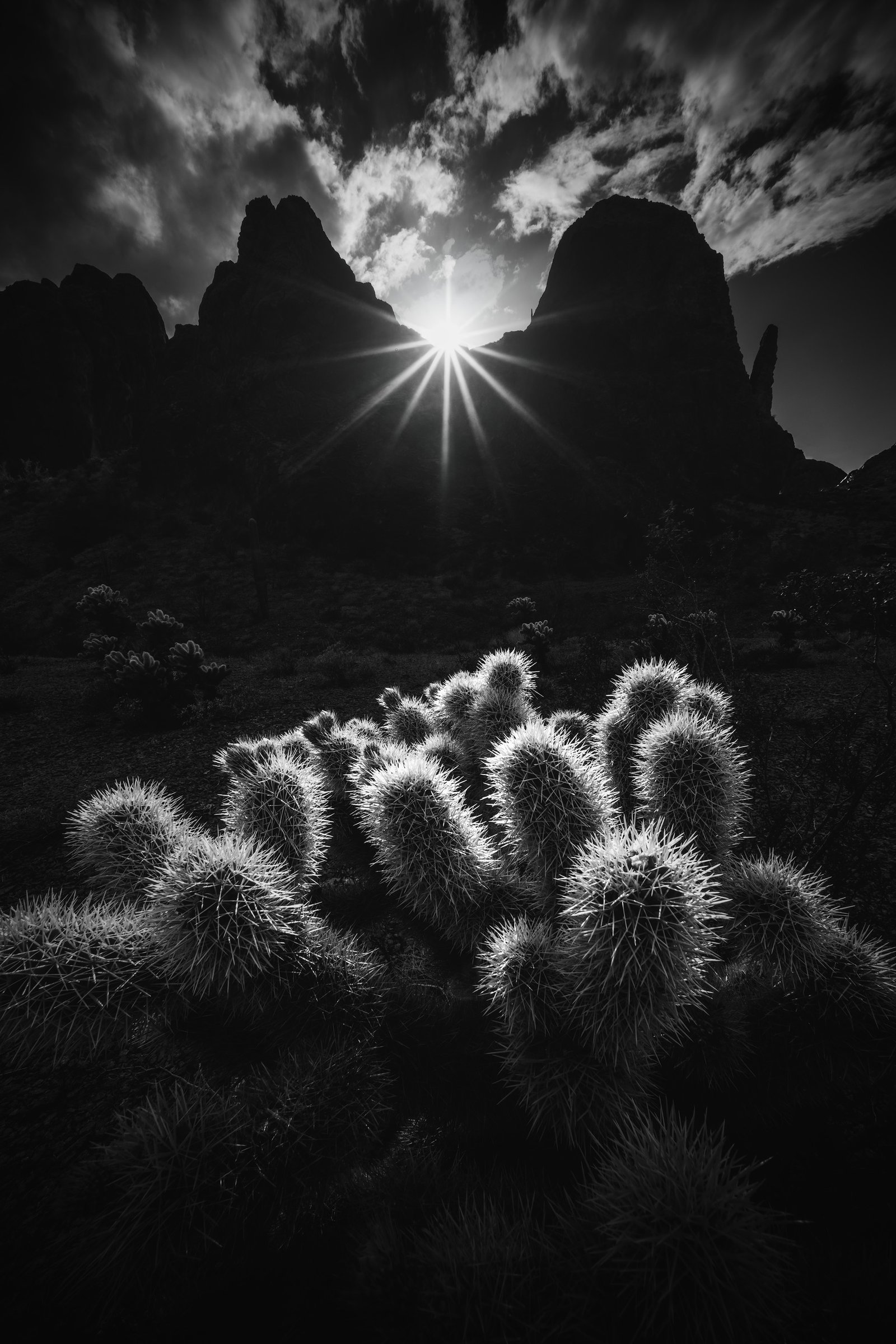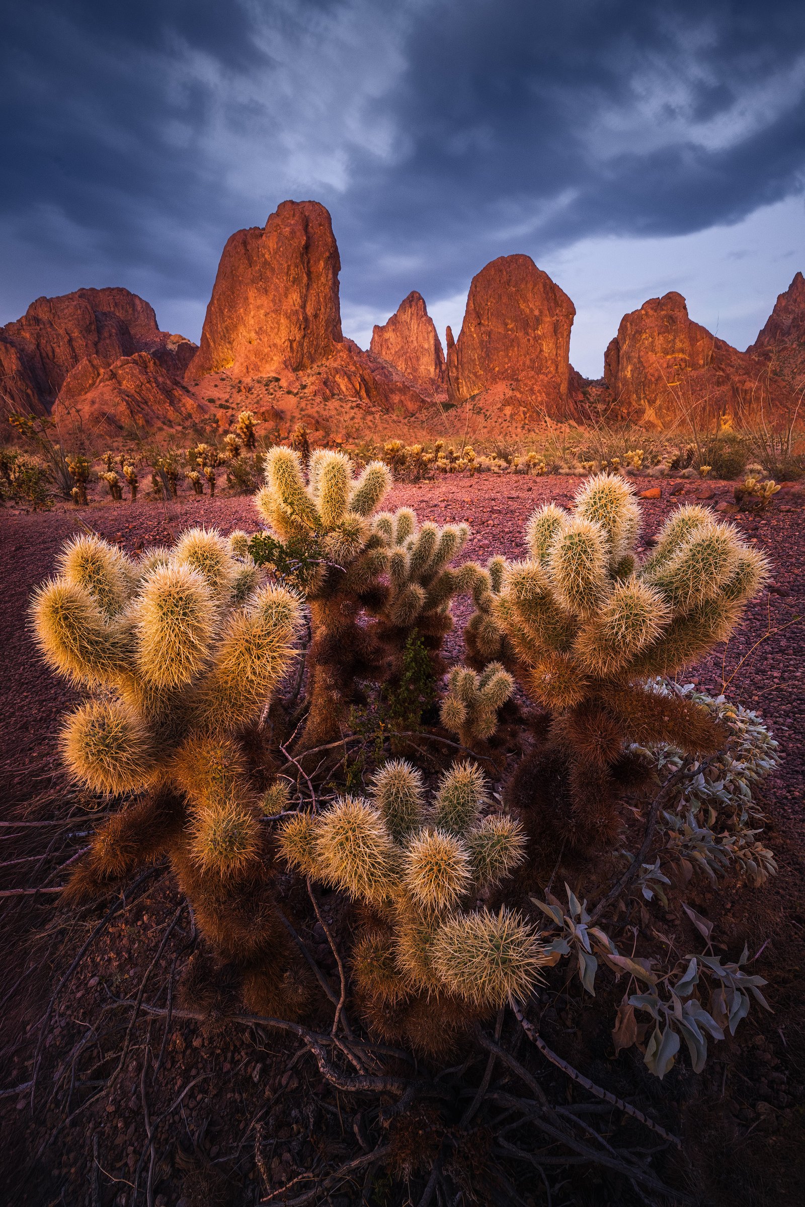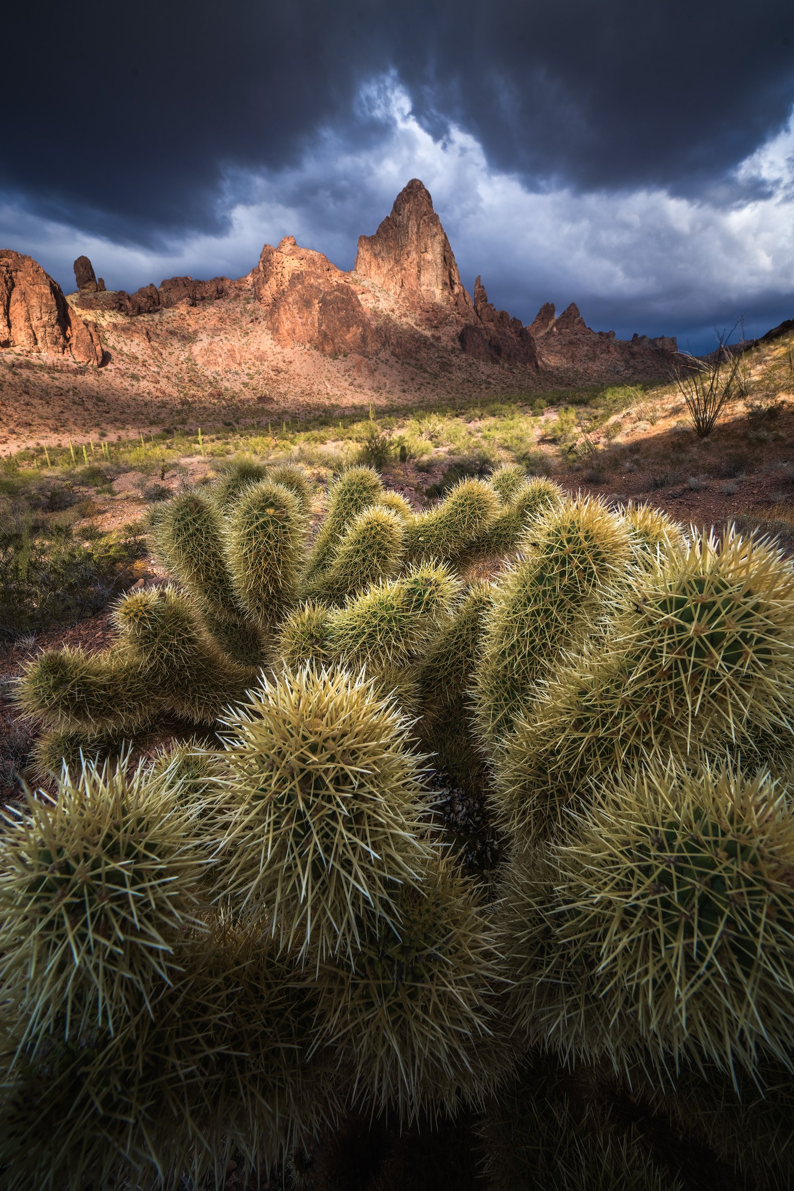 The mistake I see a lot is photographers standing back and letting the wide-angle do all the work. Instead, push in close and use your foreground elements intentionally. Cacti are perfect for this kind of Arizona photography because you can use them as framing elements, leading lines into the scene, or even fill the frame so completely that the midground becomes less important. Sometimes a weak or distracting midground just disappears when you get low and close enough. That tension between near and far is really what makes desert landscape photography so compelling.