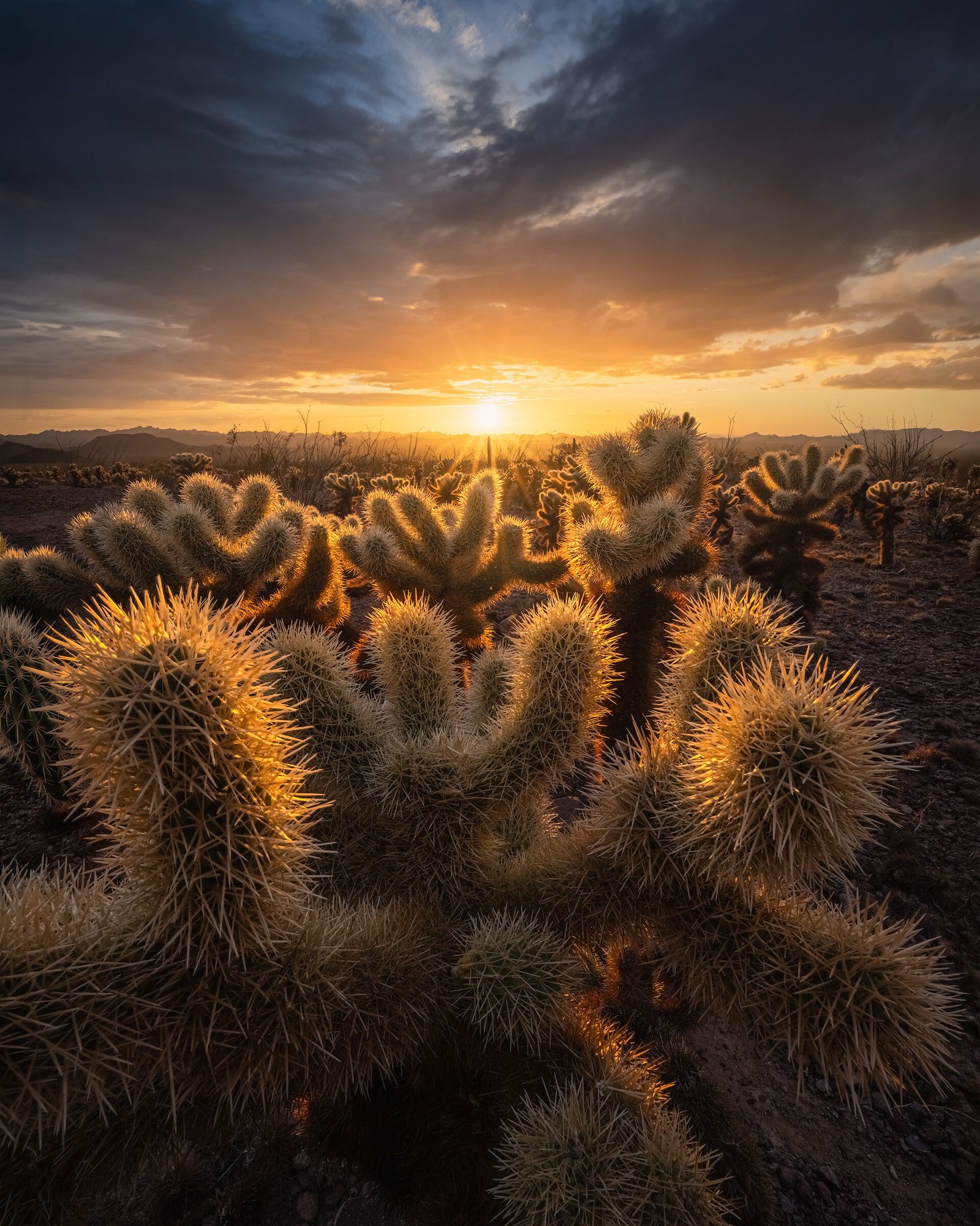 To get a well-defined sunstar in your desert landscape photography, you need to be at f/16 or smaller. The starburst is created by the shape of your aperture blades, so the more you stop down, the more defined the star becomes. Open up to f/5.6, and it’s just gone. Additionally, you want the sun positioned so it’s just peeking over the horizon, a rock edge, or between two cacti. Use it as a truly focal point rather than just something in the frame. It needs to be very intentional, otherwise a sunstar can actually distract from the overall composition.