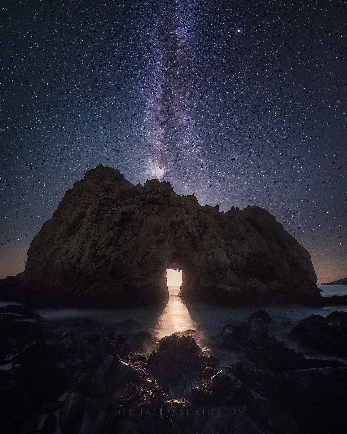 What you are seeing is a vertical panorama of moonset through the famous Pfeiffer Beach archway in Big Sur. The moon was fairly dim during this phase (18% or so) giving slight visibility to the Milky Way overhead. As the moon dipped down closer to the horizon the Galaxy became visible enough to even see some subtle nebula colors. The panorama consists of about 5 shots overlapping starting from almost completely overhead all the way facing down at some rocks near the tripod legs.