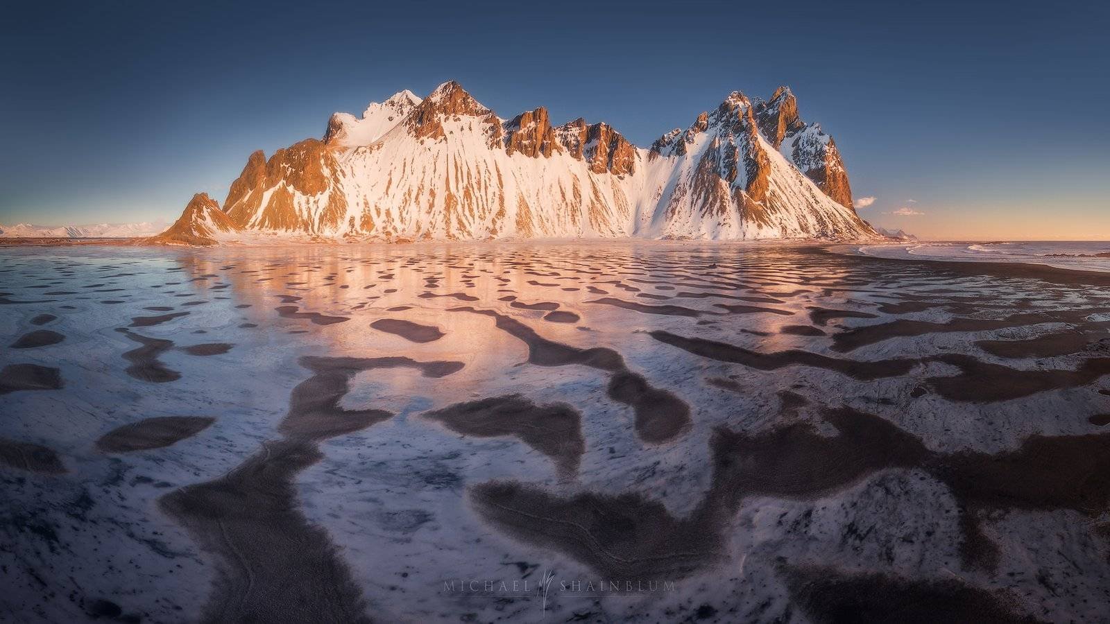 The Vestrahorn mountain in Iceland is a very iconic peak with stunning scenery. We spent sunrise photographing this location and I pulled out my Phantom 3 Quadcopter to take this aerial panorama. The formations of ice and sand made for some incredible shapes/textures. Most of our sunrises and sunsets were completely overcast or sunny blue sky with no cloud action. For this Iceland aerial however, I enjoyed the simplicity in the sky complimenting the complex foreground.