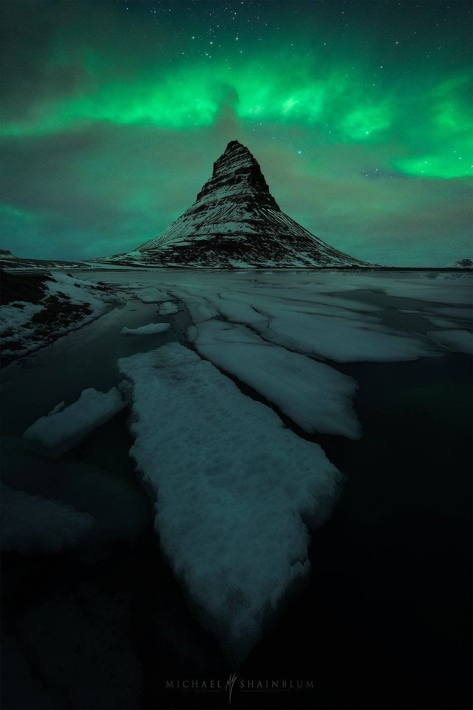 Aurora photography over Iceland was, by far, one of the most amazing experiences that I have ever had whilst shooting landscapes. I thought that I would be prepared for the incredible display of light and movement, but nothing prepares you for just how unreal it is in person. There were moments in time where I actually felt unable to operate my camera and found myself gazing up at the lights in awe.The first photo here is of the Aurora captured over Skógafoss waterfall. I did a vertical panorama to show as much of the landscape as I could whilst also showcasing the Northern Lights. The second photo is of the Northern Lights captured over one of the most famous mountains in Iceland, Kirkjufell. I wanted to do something different with my Aurora photography, so I found pieces of ice in the foreground that complemented and mimicked the shape of the mountain peak itself.
