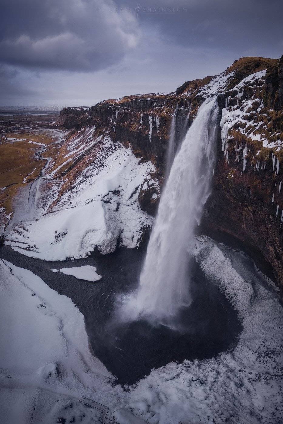 Not only is Iceland great for Northern Lights photography, but there are many other amazing landscapes to focus on. Here, I found myself intrigued by not only the incredible landscape of Iceland but also the miniature scenes that oftentimes go unnoticed. This abstract shot of ice bubbles and cracks within the ice was shot from within a few inches of the ground.This first Iceland aerial photo was taken over Seljalandsfoss in Iceland. This was actually one of the first locations that we visited on our trip. This next photo was taken directly over Skógafoss, highlighting the power of a waterfall tumbling down from above.