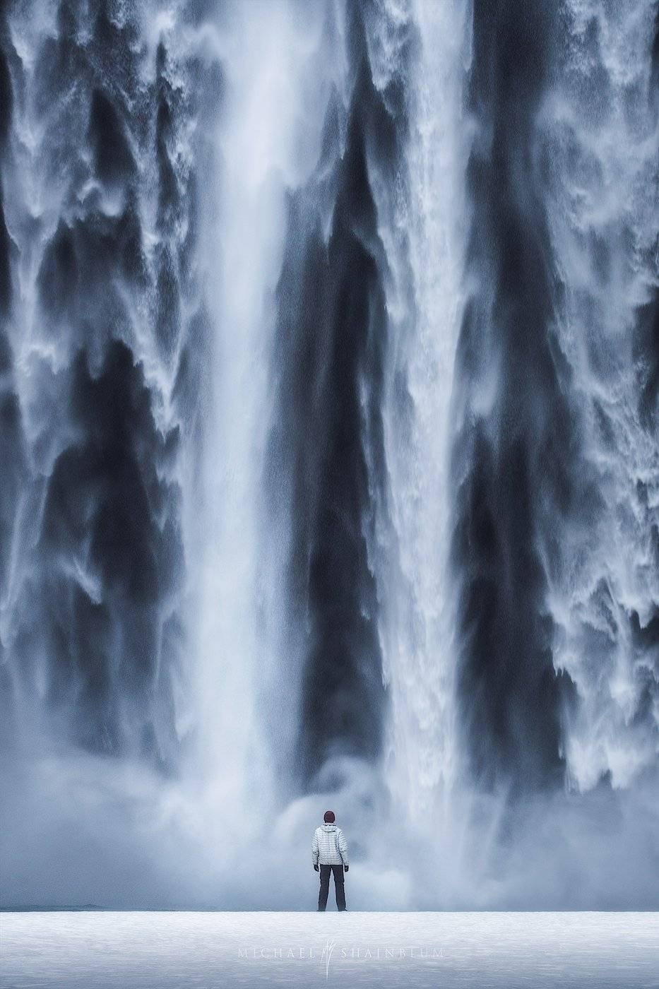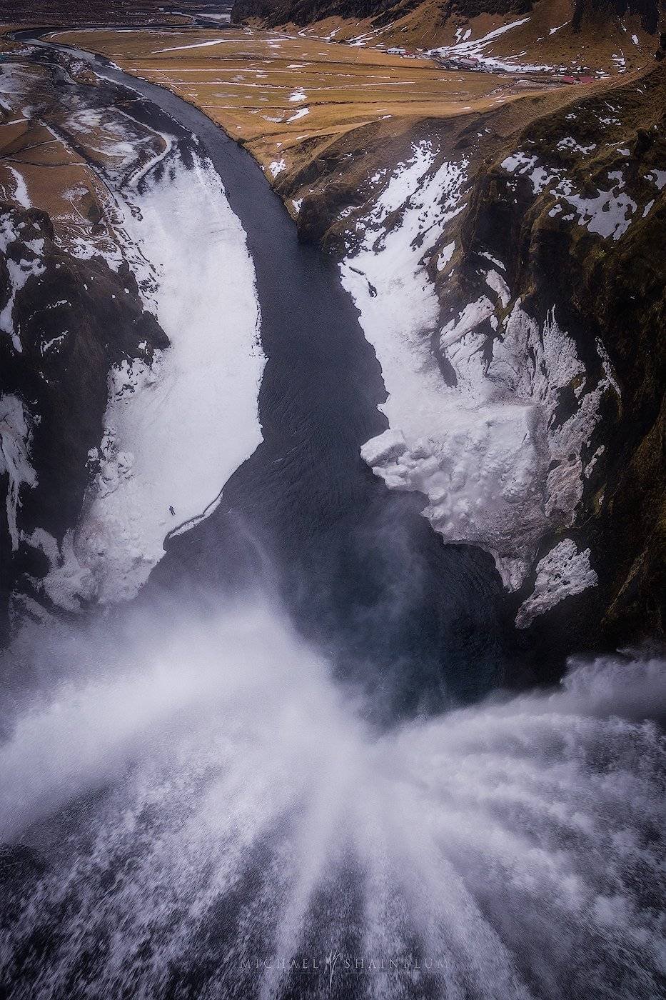 Here are two of my favorite photos from my Iceland landscape photography collection. The first is an aerial scene showing a desolate road going past a magnificent mountain peak. The second is actually a self-portrait telephoto image where I stood in front of Skógafoss. I wanted to bring in a sense of scale and include a human element into an otherwise abstract photograph.