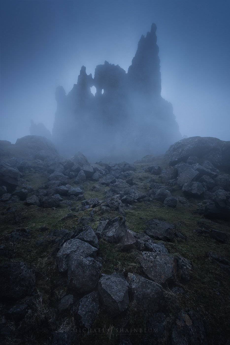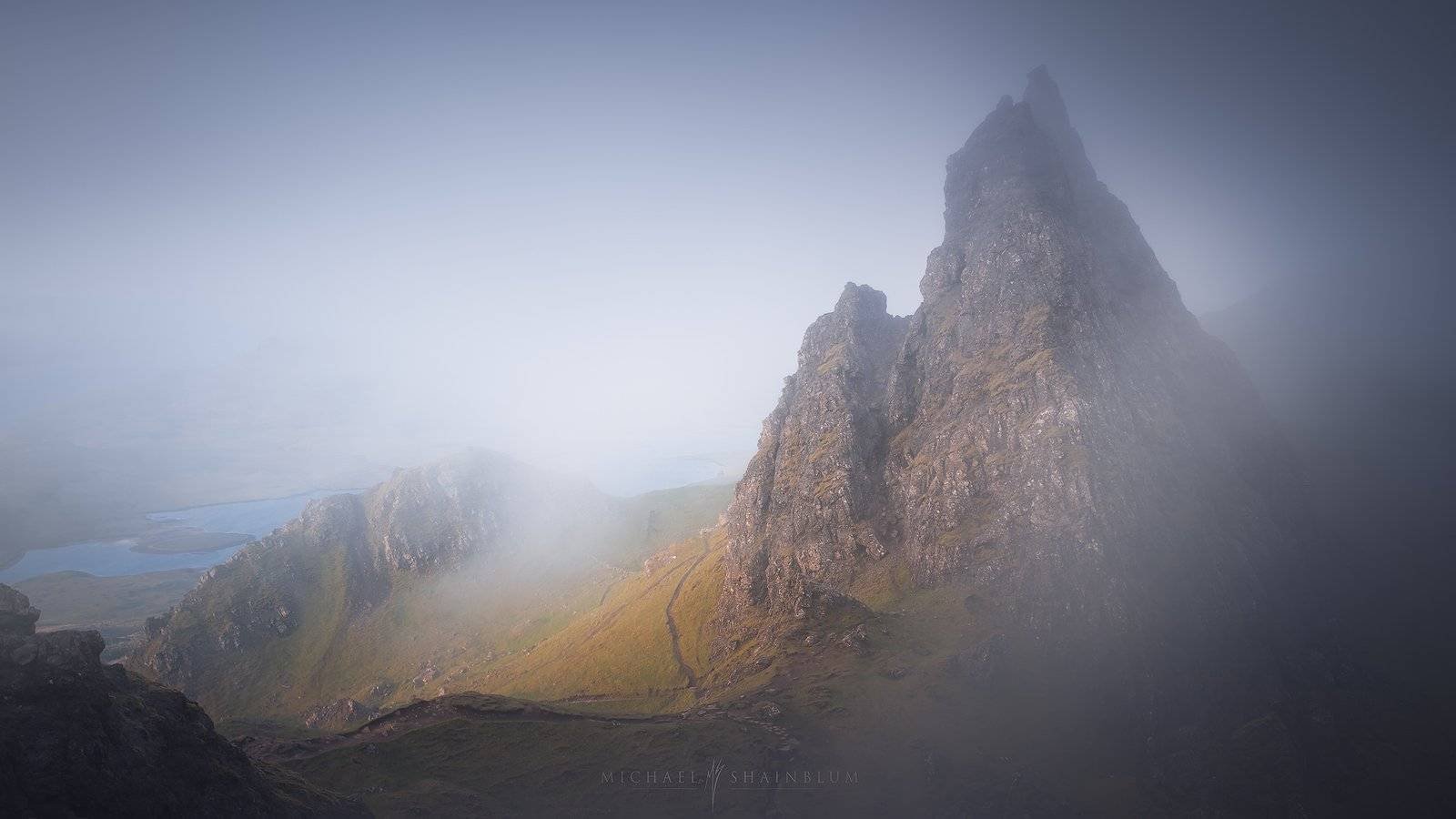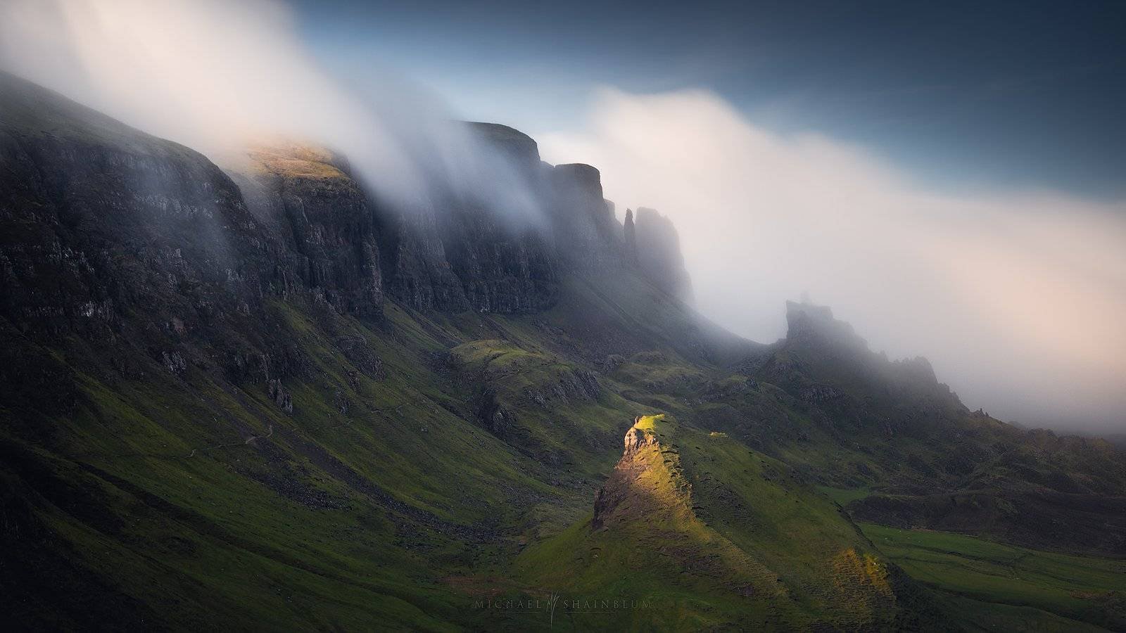 This image was taken at the Quiraing. Another beautiful spot on the Isle of Skye. With the beautiful bank of fog pouring over the cliffs, this image quickly became one of my favorite Scotland photos.